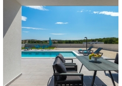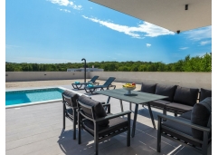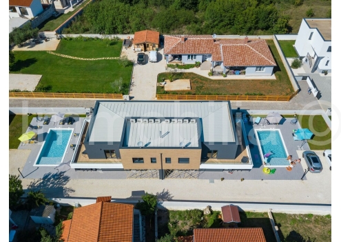The villas are mirror images of each other, each has it's own entrance, it's own pool of 38 m2 and 4 bedrooms with their own bathrooms, and together they can accommodate a total of 16 people.