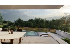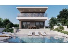 On the ground floor of the villa there is a large living room, kitchen, and dining room with access to the terrace, which is followed by stairs leading down to the swimming pool with sunbathing area.